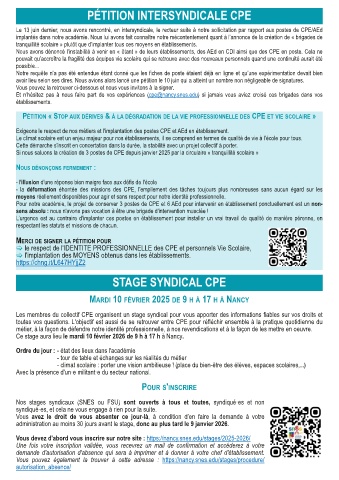 Les membres du collectif CPE organisent un stage syndical pour vous apporter des informations fiables sur vos droits et