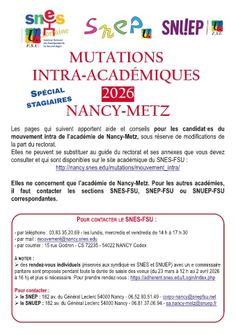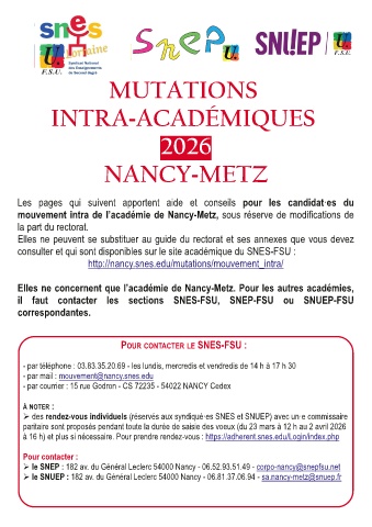 Adresse mail spécifique -Une adresse mail dédiée à laquelle poser toutes vos questions concernant le mouvement et pour nous faire parvenir une copie de votre dossier de demande de mutation : mouvement@nancy.snes.edu |